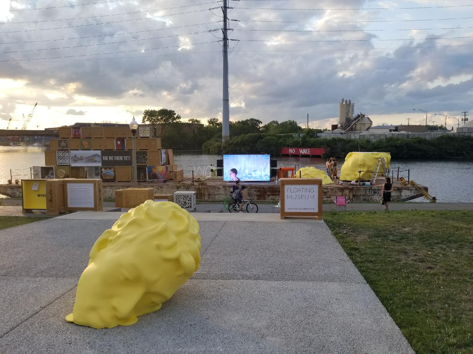 Founder was created by Floating Museum as part of the larger, multifaceted River Assembly project. Founder is a 12' yellow-colored styrofoam rendering of Jean Baptiste Pointe du Sable, the first known non-indigenous settler of Chicago. Founder was milled from foam using a 3D-scan of Erik Blome's sculpture of Jean Baptiste Point Du Sable, installed on Michigan Avenue in 2009. River Assembly was conceived in part to draw attention to the infrastructure, history and aesthetics of the Chicago River and its importance as a Chicago cultural asset.
