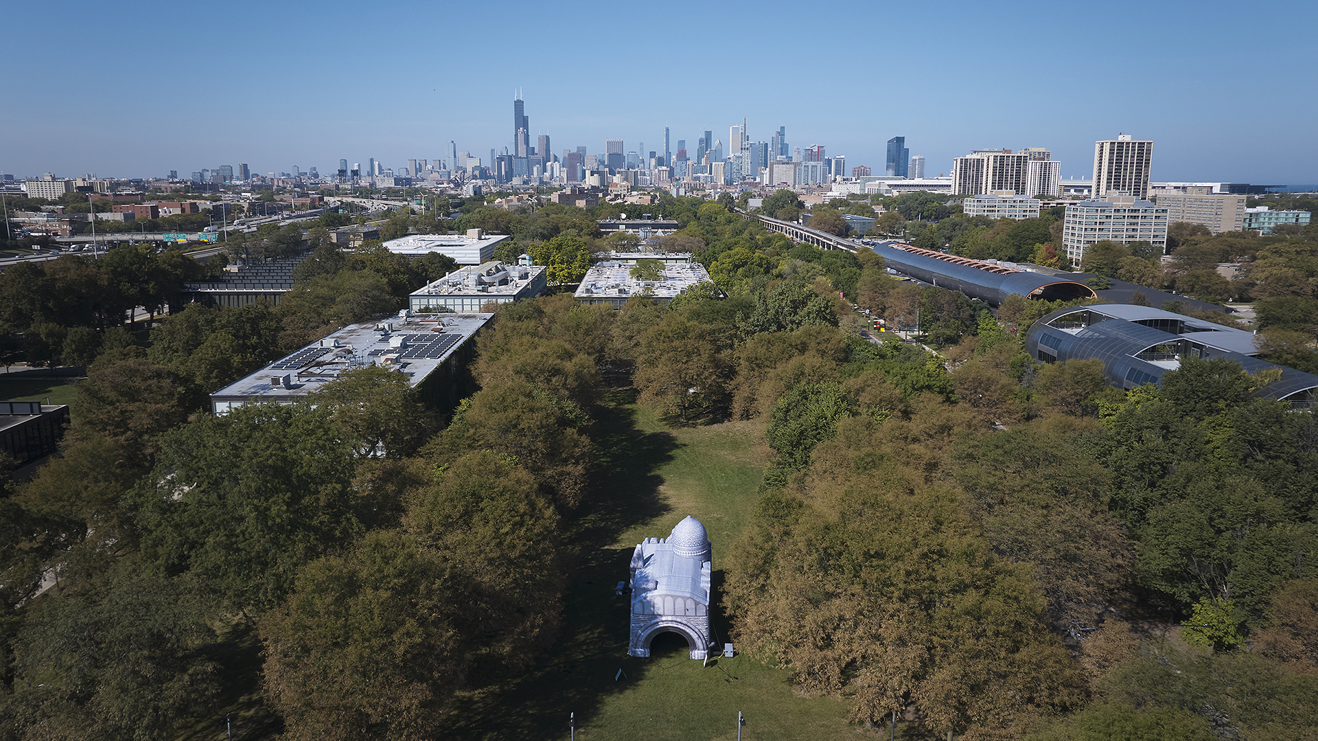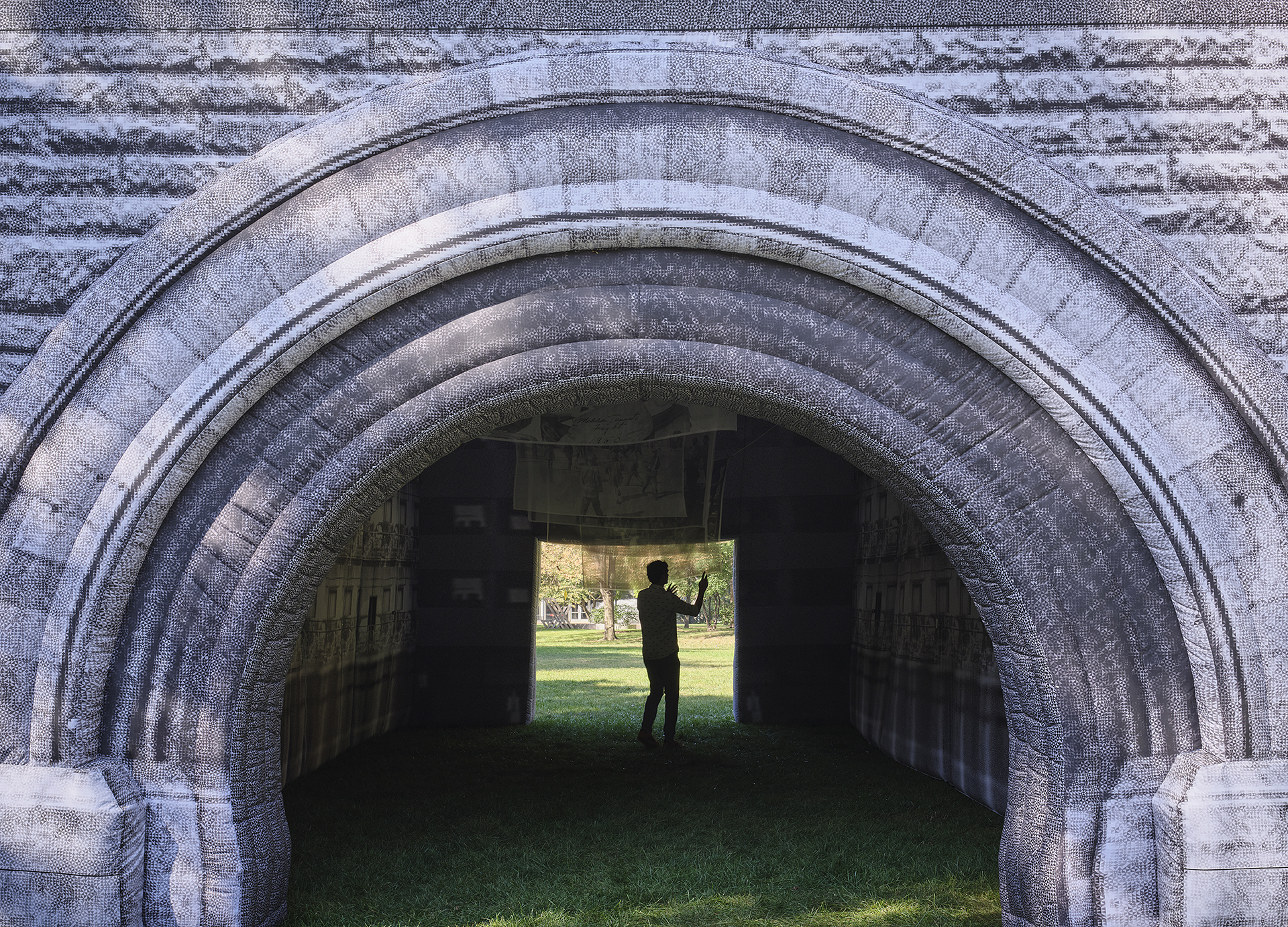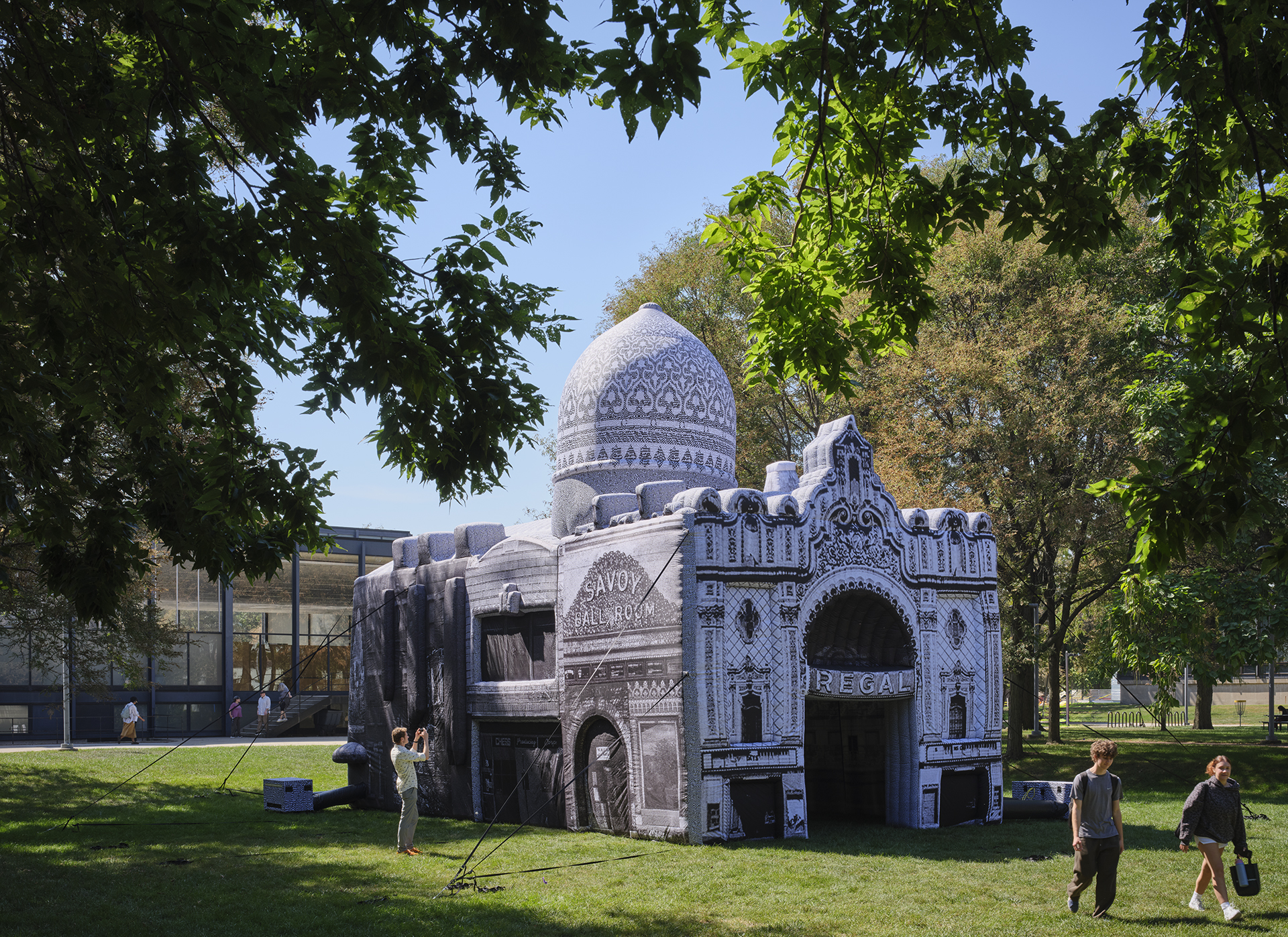 for Mecca is part of Floating Museum’s Floating Monuments series. A ghostly, inflatable architecture, this monument moves to sites across Chicago and beyond, serving as a dynamic platform for memory, conversation, exhibition, performance, and education. Its design honors the Mecca Flats apartment building—once a vibrant center of Black life in Chicago’s Bronzeville—and conjures traces of the neighborhood’s historic architecture. Though the Mecca Flats building was demolished in 1952 in the name of urban renewal, its legacy lives on through art, music, and memory.
